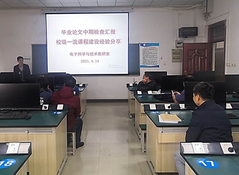 为进一步加强教研室建设,切实发挥教研室在教学、科研、管理等工作中的作用,4月14日下午电子科学与技术教研室在致知楼2519实验室开展了毕业论文中期检查汇报和一流课程建设经验分享会,电科教研室全体成员出席了会议,会议由教研室主任任玲芝主持,教务处副处长谢如龙、电子工程学院副院长叶松到会指导。