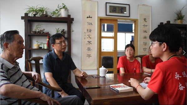 懒悟艺术馆馆长张庆致力于安庆地域文化研究,近年来举办红色教育系列展览,为市民打造“红色平台”,传播红色文化,作为市政协委员在2020年以《关于加快陈延年、陈乔年读书处建设的建议》进行了提案。在访谈中,团队成员欣喜地了解到,陈延年、陈乔年读书处修缮方案已由官方通告确定,目前项目前期工作正在积极开展中。该馆党支部书记李银德老先生现年90岁高龄,是“光荣在党50年”勋章获得者,李老先生既是这些展览的策划者与筹备者,同时也是义务讲解员,即使退休多年,他仍然发挥余热,甘于奉献。在听到团队成员与张馆长谈到《觉醒年代》后,殷切地对队员们说:“站起来,强起来,富起来,要先有‘醒过来’!”