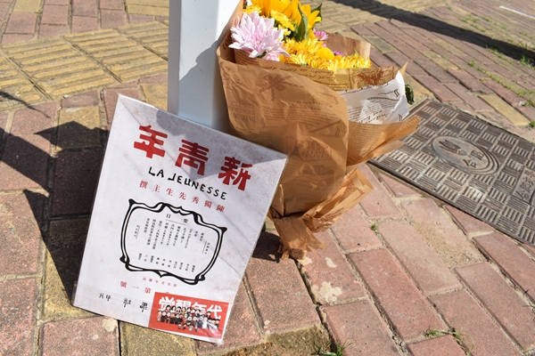 7月21日,团队成员来到此行最后一站:延乔路。这一条最近大热的道路取名于“延年、乔年”,正是为了纪念这两位英烈,延乔路旁为集贤路,尽头是繁华大道。随着《觉醒年代》持续热播,越来越多的市民来到延乔路寄托对革命先烈的纪念和哀思。延乔路口处竖立着陈延年、陈乔年事迹介绍的展板,展板下堆满了鲜花,现场除了手写卡片,还有市民的手绘画作,画中的陈氏兄弟眼前繁花似锦,满是光明。通过6天的深入调研走访,团队成员对陈延年、陈乔年为革命从容赴死的事迹有了更透彻、更真切的体会:“在汗流浃背的调研过程中,我对陈延年、陈乔年的认识好像变得不一样,更能感同身受了,他们一腔爱国热血,一身侠肝义胆,一生为国为民,我们应该永世铭记。”