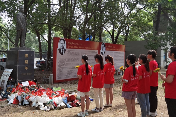 安庆市迎江区湖心中路的青少年宫内矗立着一座陈延年同志的雕像。团队到达时,看到雕像前堆满了或崭新或枯萎的花束,仿佛回到了革命烈士陈延年壮烈牺牲94周年纪念日那天的壮观场面。团队成员在雕像前献花默哀,深切缅怀陈延年、陈乔年兄弟。成员们高举右拳,用响亮的声音坚定宣誓:“以史为鉴,开创未来!请党放心,强国有我!”。