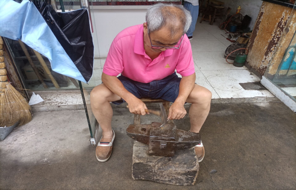 7月18日,团队成员调研了一处传统打铁铺,在这家打铁铺内,最让队员感到新奇的是打铁的机器,伴随着机器运作时发出的轰鸣声,与手艺人复杂又娴熟的操作,四十分钟左右一把锄头便制作完成。成员通过与手艺人的访谈和问卷调查,了解店铺的历史、手艺人的学习过程以及现实中存在的困难,团队成员纷纷建言献策,从自己所学专业角度谈了自己的看法,并提出了建议,表示将通过新媒体加强对非物质文化遗产的宣传,争当文化宣传的使者,讲好柘皋故事。
