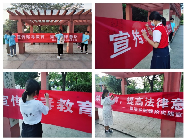 在马鞍山市花果山公园,志愿者带着“宣传禁毒教育,提高法律意识”的横幅,向过往行人介绍禁毒教育相关的知识,并邀请他们在横幅上进行签字。五米长的横幅留下了人们对禁毒宣传教育的赞同与支持,笔尖下不仅是一个个名字,更是禁毒与法律意识一次次的传递和深化。公园宣讲,再次敲响“珍爱生命,远离毒品”的警钟,深刻诠释了禁毒教育理论实践团的志愿宗旨。