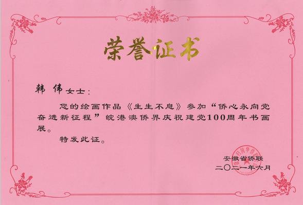 6月底,“侨心永向党奋进新征程”——皖港澳侨界庆祝建党100周年书画展在合肥开展。学校高度重视作品征集工作,注重发挥高校专业优势,经党委统战部与艺术学院党委共同遴选推荐,我校侨联会员、艺术学院教师韩伟的绘画作品《生生不息》参加展览。