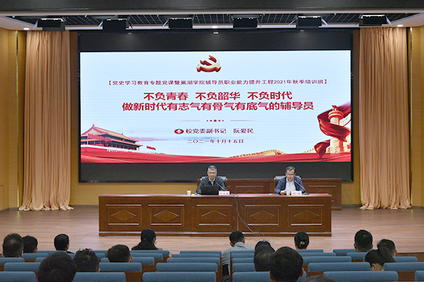 10月15日下午,校党委副书记阮爱民为学校辅导员职业能力提升工程2021年秋季培训班授课,以党史学习教育专题党课的形式作题为“不负青春不负韶华不负时代做新时代有志气有骨气有底气的辅导员”的报告。全校专兼职辅导员参加报告会,报告会由学工部部长周祥主持。