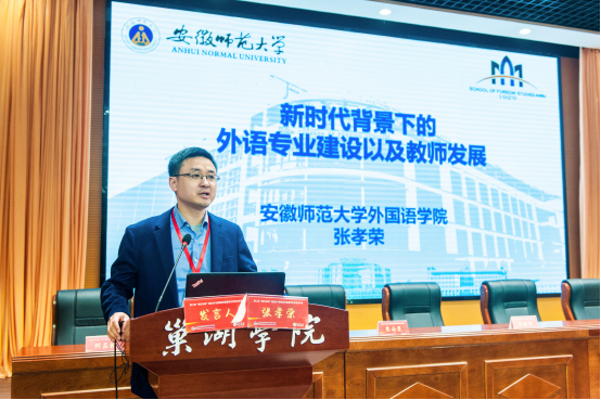 安徽师范大学张孝荣教授主旨发言题目为《新时代背景下的外语专业建设和教师发展》。他指出,在新文科建设背景下,外语专业需要重新审视专业建设所面临的问题,专业建设的策略以及教师发展的途径。外语专业建设需要实现人文回归,提升学生语言学、文学、翻译学、跨文化知识能力以及人文素质。外语专业教师应该不断强化专业能力,实现外语教师综合能力的国际化和本土化融合,在人才培养、科学研究、社会服务、国际交流与合作、文化传承与创新五个方面开展工作,实现个人规划、专业建设、学科建设的协同发展。