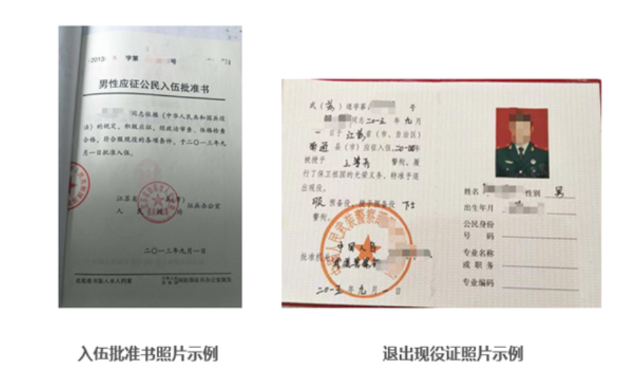 6.报考“退役大学生士兵”专项硕士研究生招生计划的考生还应当提交本人《入伍批准书》和《退出现役证》原件的照片。示例如下: