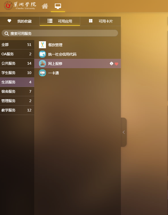 1.网站报修。访问校园网智慧巢院,搜索“网上报修”找到应用并进入,如图1所示;也可在左侧“可用应用”一“生活服务”点击网上报修即可,如图2所示。