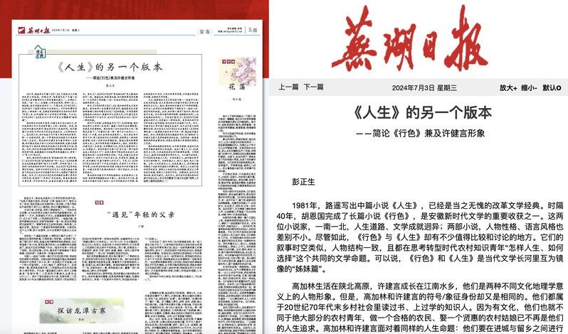 彭正生教授在《芜湖日报》2024年7月3日第5版发表题为《〈人生〉的另一个版本——简论〈行色〉兼及许健言形象》的文艺评论文章。