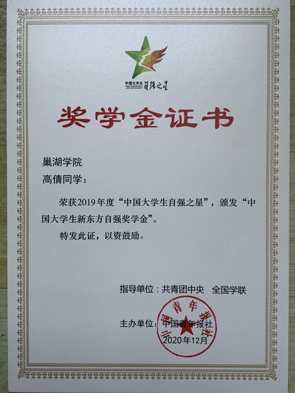 18电气2班高倩同学荣获2019年中国大学生自强之星