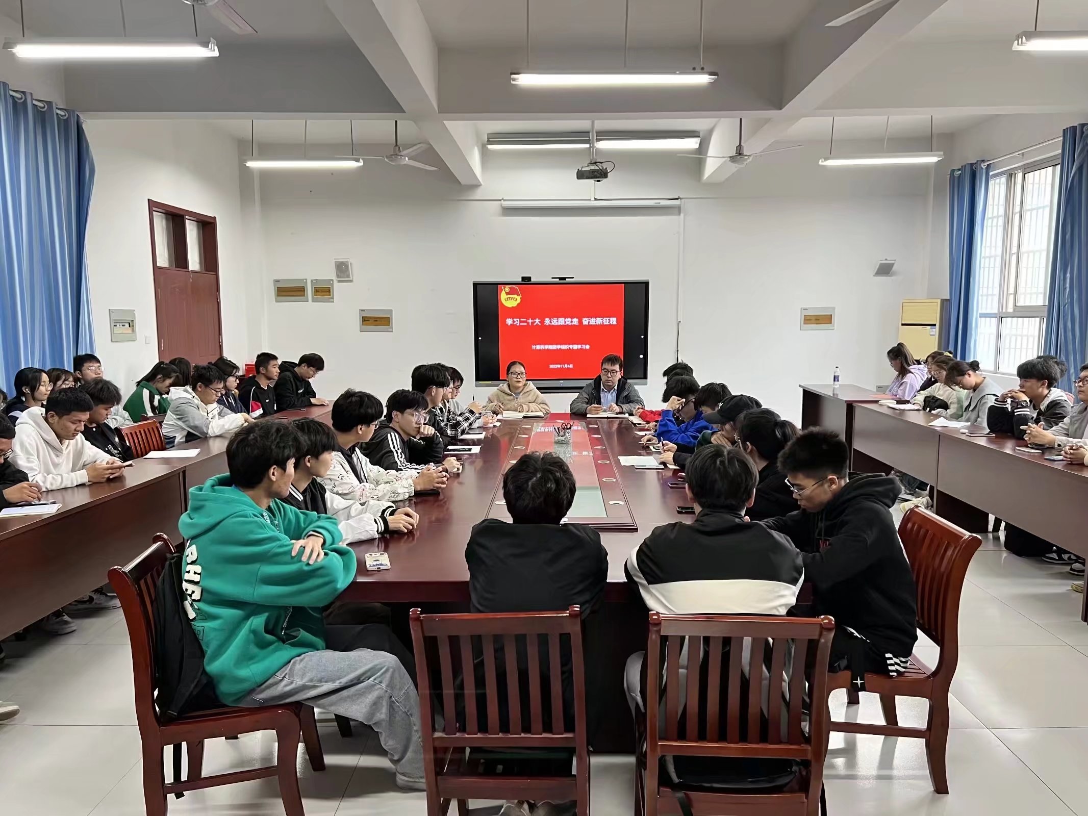 院团总支于11月4日13:00在学院会议室开展“学习党的二十大精神”专题学习。会上,团总支书记刘小燕带领同学们集中学习党的二十大报告中关于教育和青年发展的重要论述,她希望同学们坚定理想信念,刻苦努力学习,发扬实干精神,增强服务意识。团总支副书记姜飞要求同学们把“小我”融入“大我”,培养积极奉献的精神,要能吃苦、脚踏实地,争做不畏艰难的好青年。学习中,同学们积极交流研讨,分享自己的学习感悟。