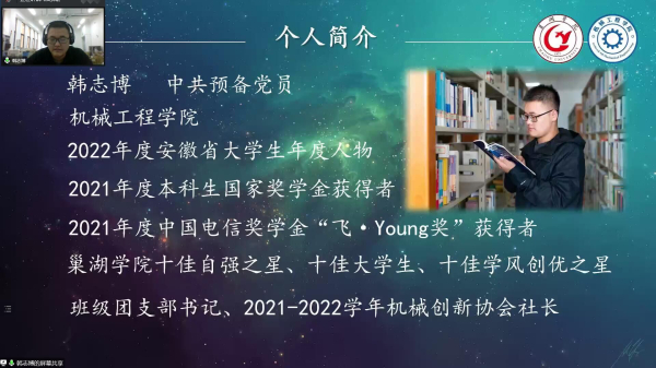 机械工程学院2020级机械设计制造及其自动化专业学生韩志博曾获第十五届全国大学生节能减排社会实践与科技竞赛三等奖、第九届挑战杯安徽省大学生课外学术科技作品竞赛二等奖、第七届安徽省“互联网+”大学生创新创业大赛银奖,主持国家级大学生创新创业项目2项,公开发表学术论文4篇,今年10月获评2022年度“安徽省大学生年度人物”。会上,他就如何成长成才作题为“矢志创新强国有我”的交流分享,他结合自身参与科研项目、学科竞赛的初衷和亲身经历同与会学员分享心得感悟,通过一个个生动的案例勉励培训班学员求真务实、真抓实干,珍惜学习机会,保持良好心态,不断提高创新能力,磨练过硬本领。