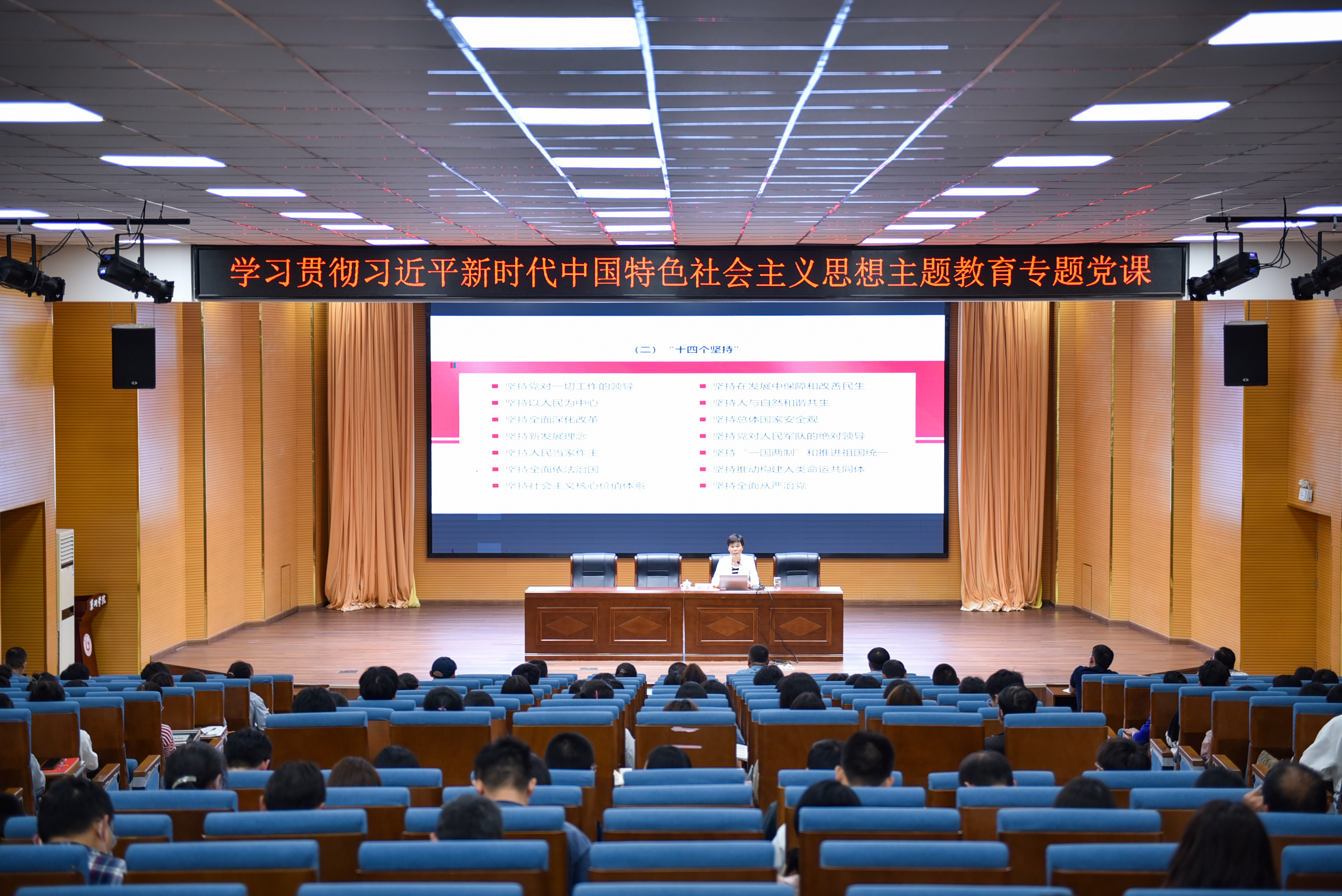为深入开展学习贯彻习近平新时代中国特色社会主义思想主题教育,推动学校高质量发展,5月23日下午,学校党委副书记、校长张莉以《牢牢把握习近平新时代中国特色社会主义思想的世界观和方法论 推动学校高质量发展》为题讲授专题党课。发规处、审计处、工商管理学院、化学与材料工程学院和体育学院等单位全体教职工和学生党员代表200余人参加党课学习。