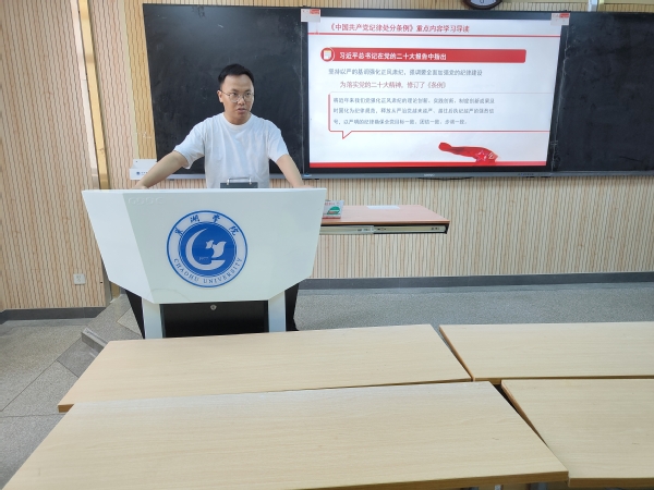 强化党纪学习,助力学风建设。工商管理学院学生第六党支部于5月23日在博学楼514教室开展党纪学习教育主题党日活动。支部书记葛晓龙主持活动,全体党员参加。