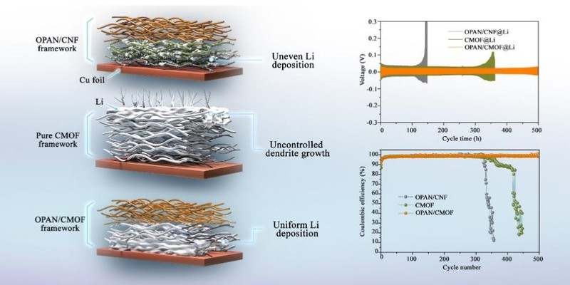 近年来,锂金属负极由于其高理论比容量(3860 mAh/g)和低电极电势(-3.04 V vs标准氢电极)等优势备受科研工作者关注。本研究工作针对锂金属负极存在的枝晶和体积膨胀等关键性问题,通过静电纺丝将聚丙烯腈有机层和金属-有机框架(MOF)衍生物无基层相结合设计了一种分层多功能的三维复合骨架(OPAN/CMOF)来构筑复合锂金属负极,调控金属锂的沉积行为。