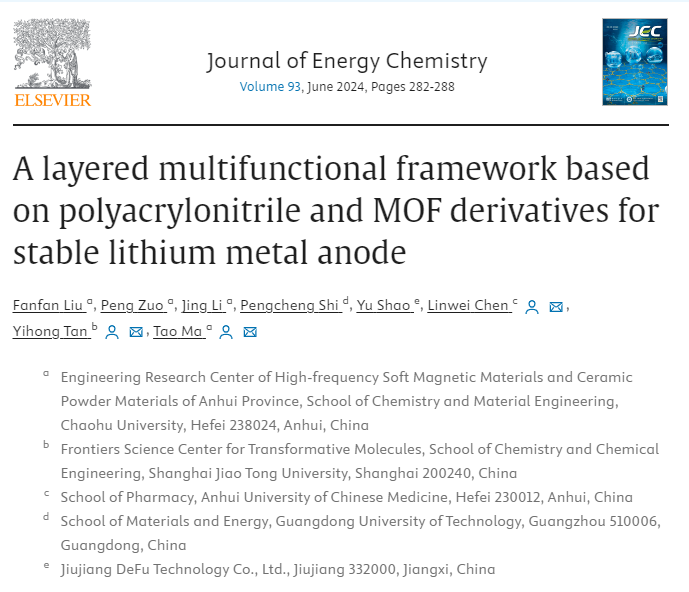 近日,“中心”超细粉体制备与应用团队成员马涛博士(通讯作者)在高性能复合锂金属负极研究中取得进展,相关研究成果以“A layered multifunctional framework based on polyacrylonitrile and MOF derivatives for stable lithium metal anode”为题发表在国际权威期刊《Journal of Energy Chemistry》(SCI收录,IF:13.1)。