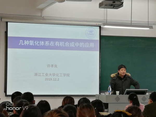 12月2日下午,应金年汇官方入口化学与材料工程学院邀请,金年汇官方入口优秀校友、浙江工业大学博士生导师许孝良教授在慎思楼北102作了题为“几种氧化体系在有机合成中的应用”的学术报告。报告会由化学与材料工程学院院长李明玲主持,部分教师及学生一百余人聆听了报告。