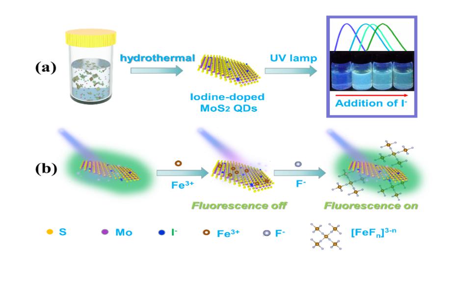 ,就会诱发氟斑牙、骨畸形、肾结石、甚至癌症等疾病。如何快速、简便和精确地检测水源中的F-离子含量,对维护人类生命健康具有重要意义。水环境研究中心吴凤义老师及团队,通过水热法合成了3-5nm MoS2 QDs。并以此为荧光基体材料开发了 “turn-off-on”型荧光探针用于巢湖水体中的F-离子检测。研究发现,该荧光探针具有较强的荧光稳定性和较低生物毒性。在有其他阴阳离子和有机小分子存在情况下,荧光探针对F-离子显示很高的选择性,对水体中的F-离子检测最低检出限达1.4 μM。
