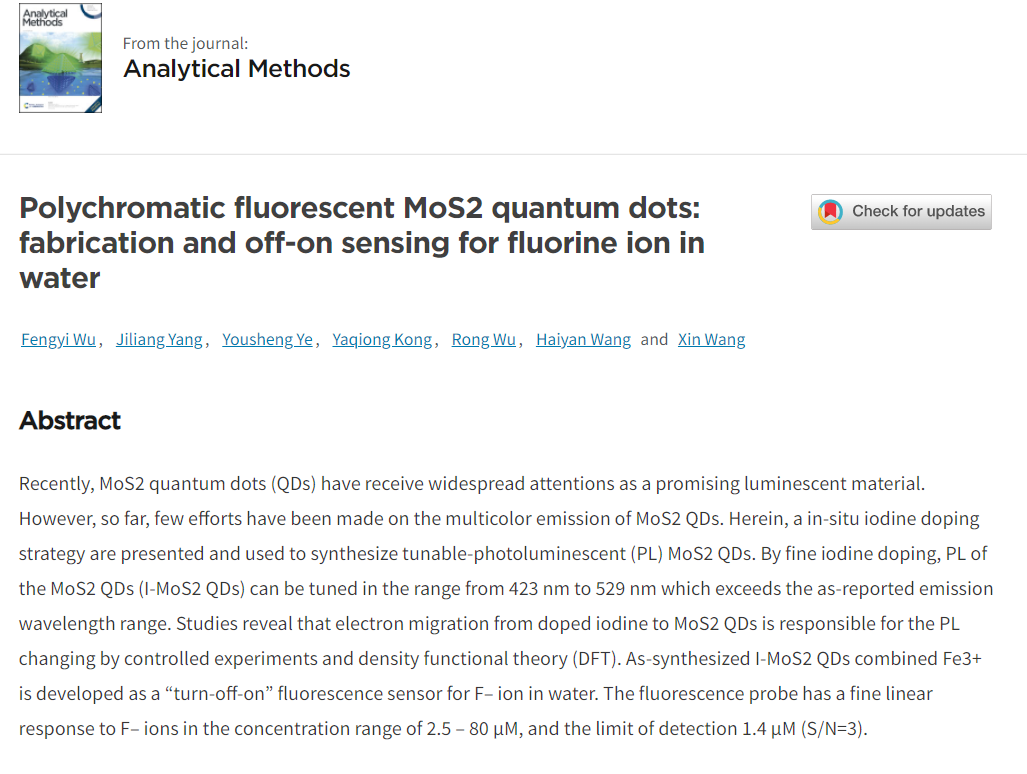 量子点(quantum dots,QDs)是指激子在三维空间上都被限域的半导体纳米结构材料。量子点在显示、光伏电池能源、分析检测有着广泛地应用。最近,金年汇官方入口水环境研究中心吴凤义老师及团队开发一种新型、环保MoS2 QDs并用于巢湖水体中F-离子检测。相关成果以“Polychromatic fluorescent MoS2quantum dots: fabrication and off-on sensing for fluorine ion in water”为题发表在国际权威期刊《Analytical Methods》(SIC收录,IF:3.532)。