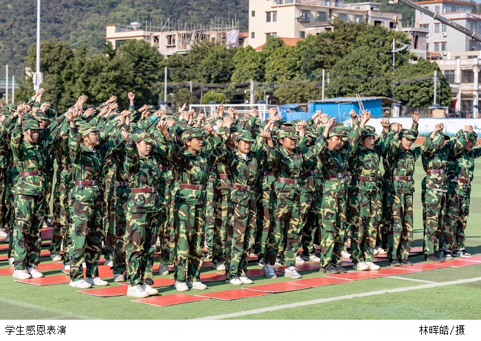 “学军人之风,塑健壮之体”。擒敌拳参演人员节奏分明、动作行云流水、一招一式力求克敌制胜;少年们手持“匕首”,动作整齐划一,大喝一声“杀”!将其飒爽英姿、正气凛然的战斗作风体现得淋漓尽致;汇操表演后,会计学院2020级新生带来感恩主题表演《感恩有你,因为有你》,感恩父母孕育之恩、感恩老师教书育人、感恩教官助其成长,感恩同学一路相伴,那些无以言表的感恩,都包含在歌声之中,铭记于心。