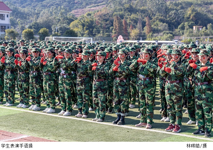 在为期14天的军训里,他们经历了烈日的考验,感知了迷彩服的责任,明白了自身的使命,建立了属于他们的迷彩世界。检阅的精彩汇操就是对他们军训取得了累累硕果的最好证明。