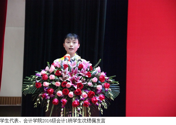 学生代表、会计学院2016级会计1班学生沈锶佩回忆起三年前怀揣着梦想来到广理,这三年,感受到学校为学生创造的越来越好的校园条件,以自身成长经历表达了对母校的感谢,并鼓励同学们不忘自己曾是广理人,牢记广理的"修德 求是 笃行 创新"八字校训,脚踏实地的开创新成就、新征程。