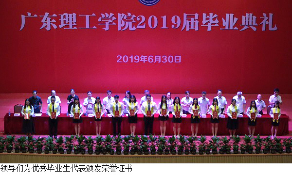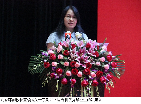 刘香萍副校长宣读了《关于表彰2019届专科优秀毕业生的决定》,决定授予周沁沄等 168 名同学“优秀毕业生”称号。主席台就座的各位领导分别为优秀毕业生代表、毕业生代表颁发了荣誉证书和毕业证书。