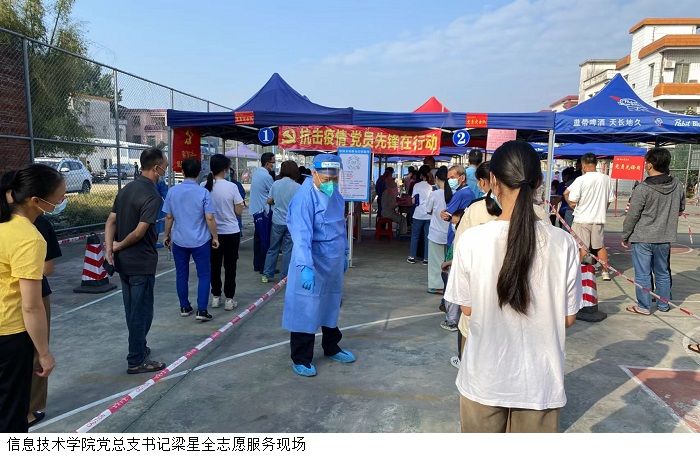 “我是一名教师中共党员,要做好带头作用,第一批我先上!”当接到疫情防控命令时,信息技术学院党总支书记梁星全同志率先垂范、主动请缨。11月19日早上6点,梁星全进入肇庆市端州区睦岗街道棠下社区一村的核酸检测采样点,全身心投入到疫情防控工作中。“为群众做好服务是我们党员干部的光荣使命,我们一定不辱使命站好岗,与医护人员和社区工作者一道做好疫情防控工作。”