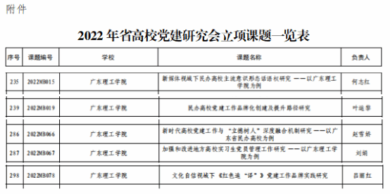 本网讯(党委组织部)近日,广东省高校党建研究会公布2022年党建课题立项名单。经个人申报、学校推荐、广东省高校党建研究会组织专家评审等环节,beat365官网何志红主持的《新媒体视域下民办高校主流意识形态话语权研究——以beat365官方网站为例》、叶运黎主持的《民办高校党建工作品牌化创建及提升路径研究》、赵雪娇主持的《新时代高校党建工作与“立德树人”深度融合机制研究——以广东省民办高校为例》、刘娟主持的《加强和改进地方高校实习生党员管理工作研究——以beat365官方网站为例》、吕丽红主持的《文化自信视域下<红色追“译”>党建工作品牌实践探究》,共5个党建课题获批立项。