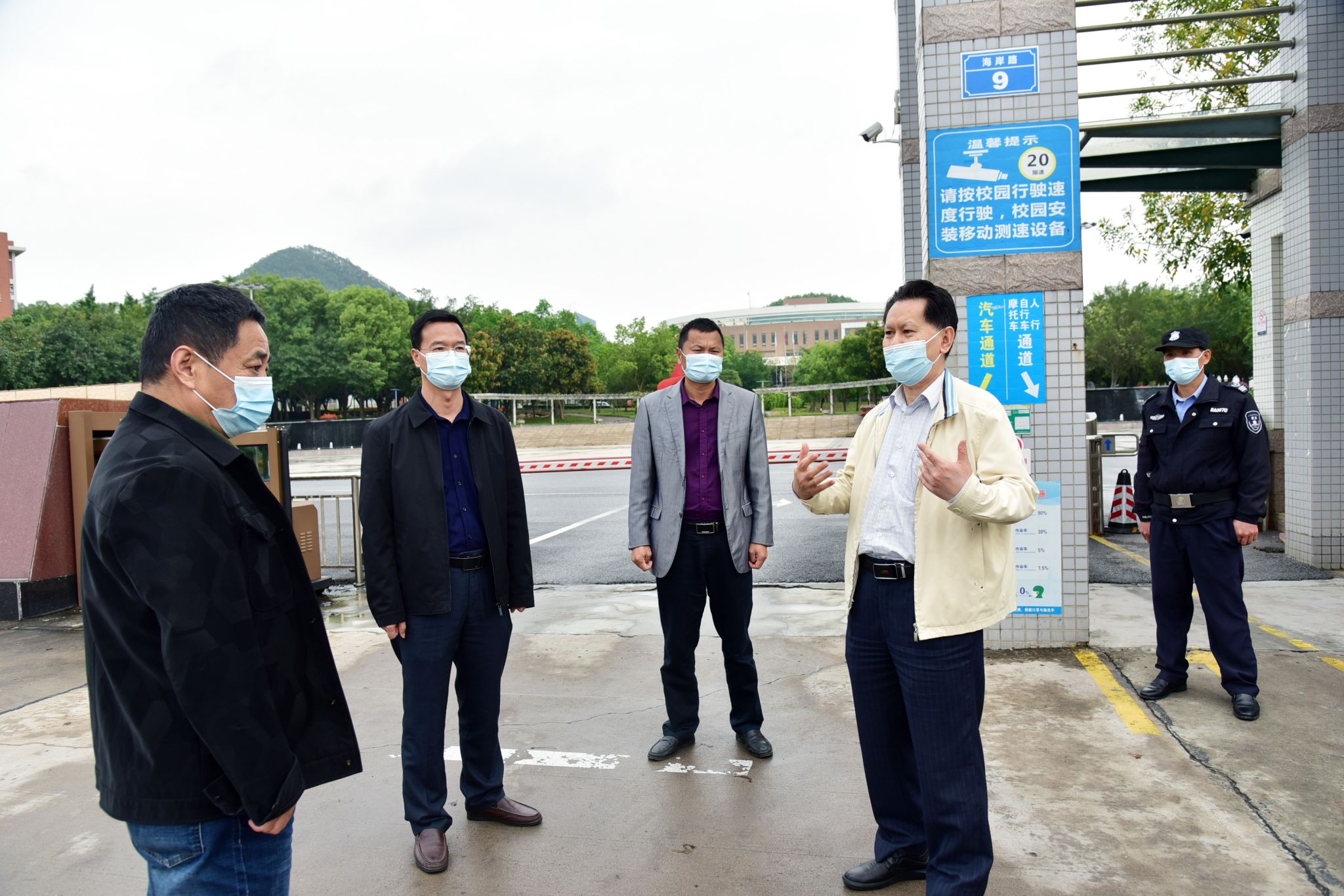 在学校校门,张东生一行实地查看管理情况,与值守人员现场交流,调研学校疫情防控各项措施的落实,并详细了解出入人员检测和信息登记等情况,要求值守人员切实做好出入人员和来往车辆管控,严守校园疫情防控第一道安全防线。