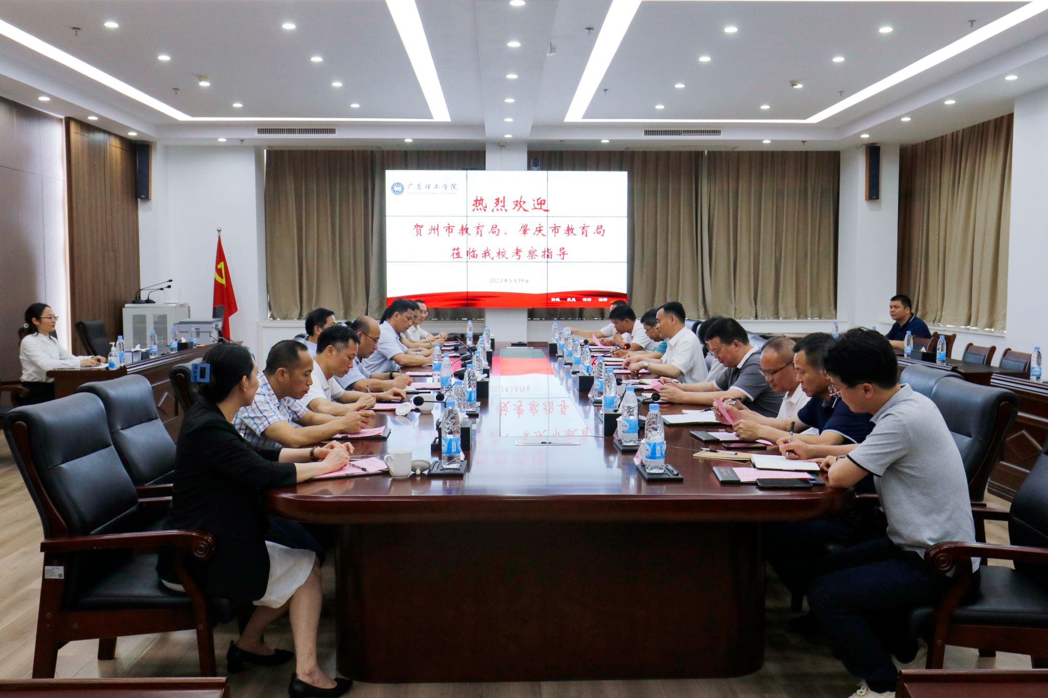 本网讯(宣传部 张昭)为增强粤桂教育协作、展开两地职业教育交流合作,5月19日上午,贺州市委教育工委书记、教育局党组书记、局长、一级调研员(组长)陈贤文,贺州市教育局党组成员、副局长(副组长)李萃雁一行莅临beat365官网开展工作交流,肇庆市教育局一级调研员罗永通等陪同。beat365官网党委副书记黎会友,校长助理唐建宁出席会议。