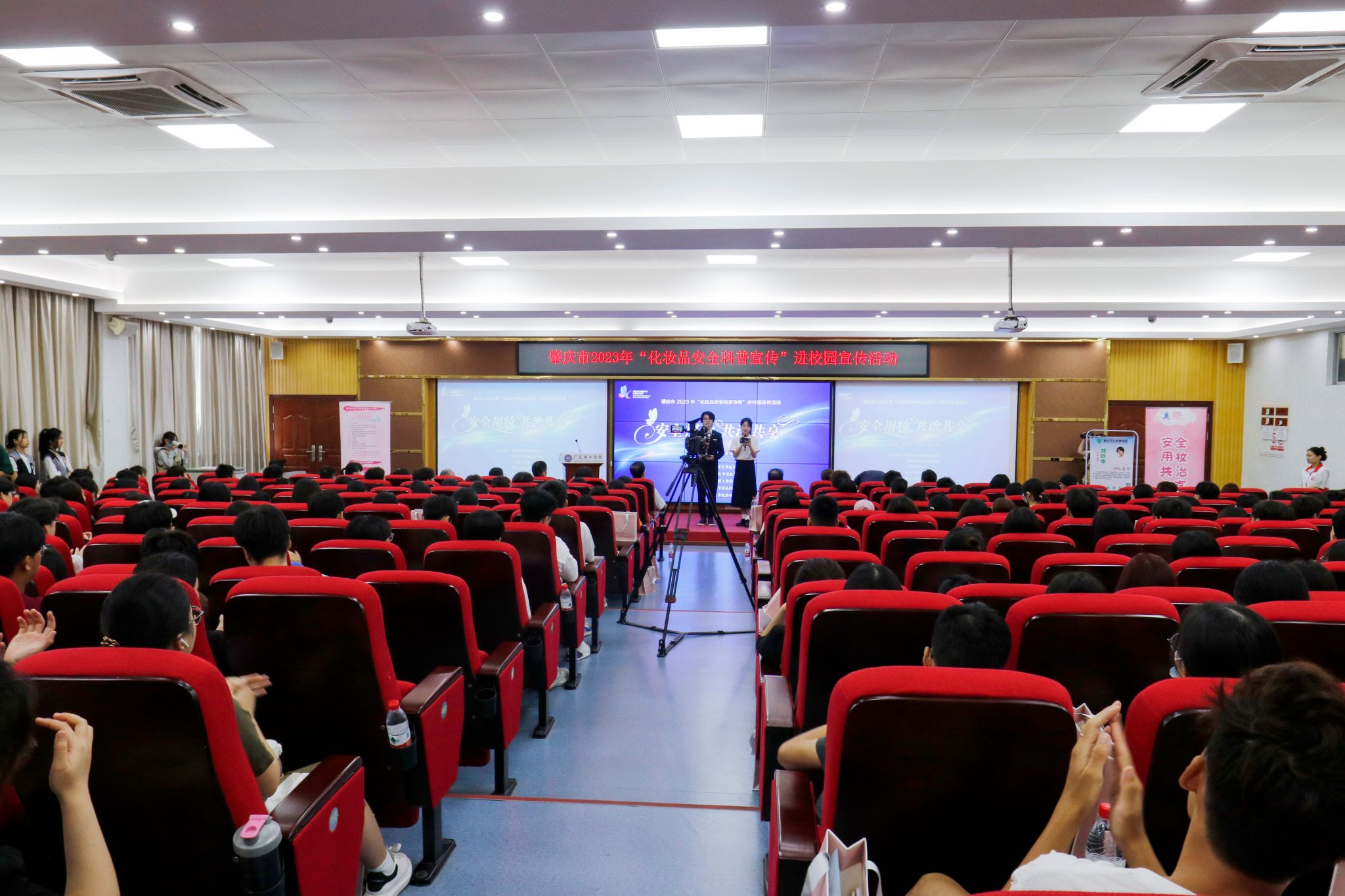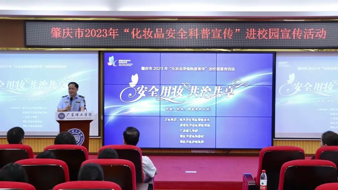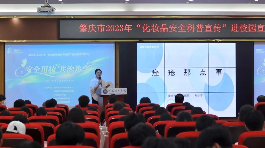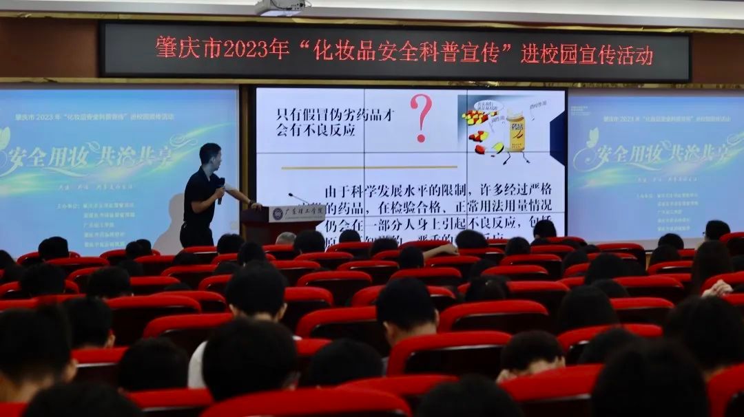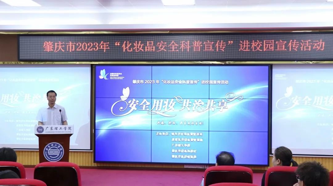 本网讯(新闻中心 图|曾馨莹 谢妙娴 张敏 吴森哲 黄天越 邓伟华 文|高荧芬 李开添)5月26日上午,由肇庆市市场监督管理局、高要区市场监督管理局、beat365官方网站、肇庆市药品检验所、肇庆市皮肤病医院共同主办的“安全用妆,共治共享”肇庆市2023年化妆品安全科普宣传进校园活动在beat365官网高要校区42栋101报告厅举行。