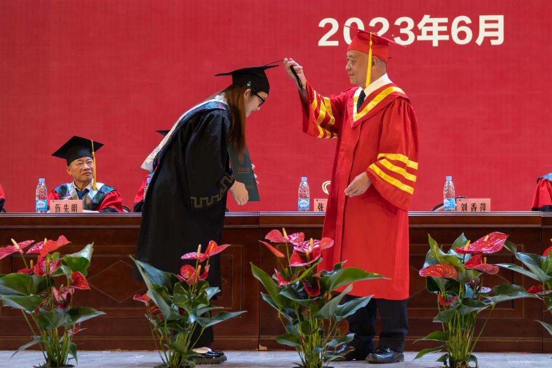 刘香萍宣读《关于授予2023届本科毕业生学士学位的决定》。张湘伟向获得学士学位的学生代表颁授学位证书、为其拨穗正冠,并合影留念。