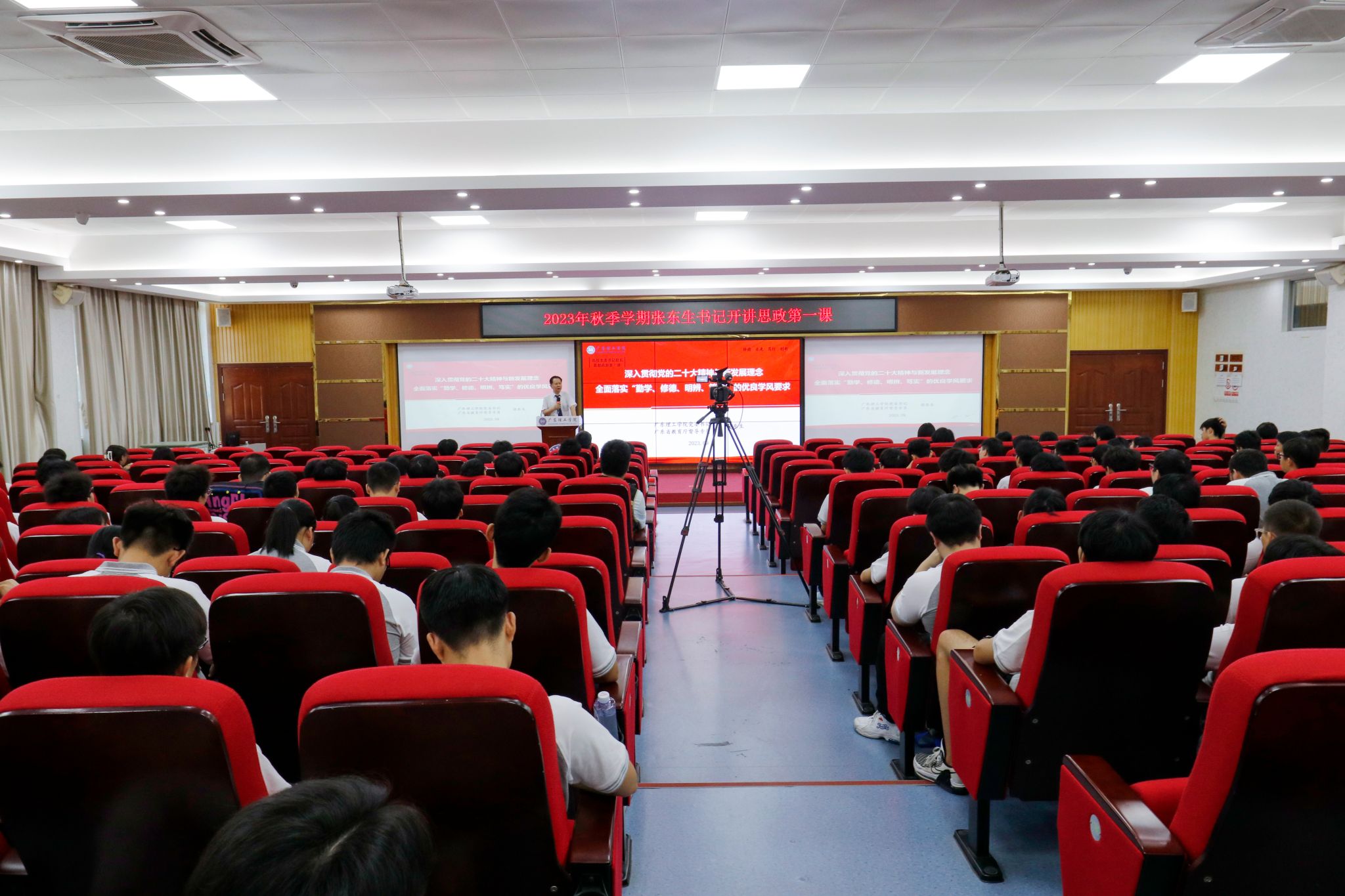 本网讯(新闻中心)为了提升思想政治教育亲和力和针对性,满足学生成长发展需求和期待,深刻理解思政课在学校课程体系中的政治引领和价值引领作用,9月20日上午,党委书记张东生在beat365官网高要校区42栋报告厅开讲主题为“深入贯彻党的二十大精神与新发展理念,全面落实‘勤学、修德、明辨、笃实’的优良学风要求”的“思政第一课”。