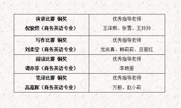 在外国语学院副院长王泽熙的带领下,外国语学院4名选手发挥出色,获铜奖4项,其中演讲比赛铜奖一项、写作比赛铜奖一项、阅读比赛铜奖一项、笔译比赛铜奖一项。祝贺以上获奖选手,衷心感谢指导老师的辛勤付出,也希望老师与选手们珍惜荣誉,再接再厉,争取在今后比赛中取得更好成绩!