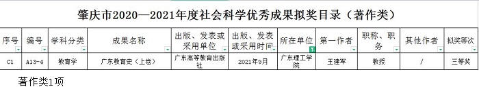 此次评奖按照《肇庆市哲学社会科学优秀成果奖励办法》的规定,经肇庆市社会科学优秀成果评审委员会专家评审,共确定了46项优秀成果奖。优秀成果奖分著作、论文、调研咨询报告三大类,每类设一、二、三等奖。beat365官网王建军老师的《广东教育史(上卷)》荣获著作类三等奖;黎传熙老师的《现代价值链下“新零售”商业模式的重构》荣获论文类一等奖,陈洪超老师的《论团体标准与企业标准自我声明公开和监督制度的理论基础——一个自我规制的解释》荣获论文类二等奖,张孟飞老师的《基于犹豫模糊偏好关系FMEA方法的改进》、黄永福老师的《我国物流业高质量发展问题研究——基于粤港澳大湾区物流业发展的分析》、陈东旭老师的《特色农产品:资源优势、内在价值与乡村振兴——以猕猴桃地理标志农产品为例》以及吴丽丽老师的《乡村振兴视域下民宿产业发展创新路径研究》均荣获论文类三等奖;郭秋芳老师的《供应链金融服务视角下肇庆产业发展与营商环境研究》荣获调研报告类三等奖。