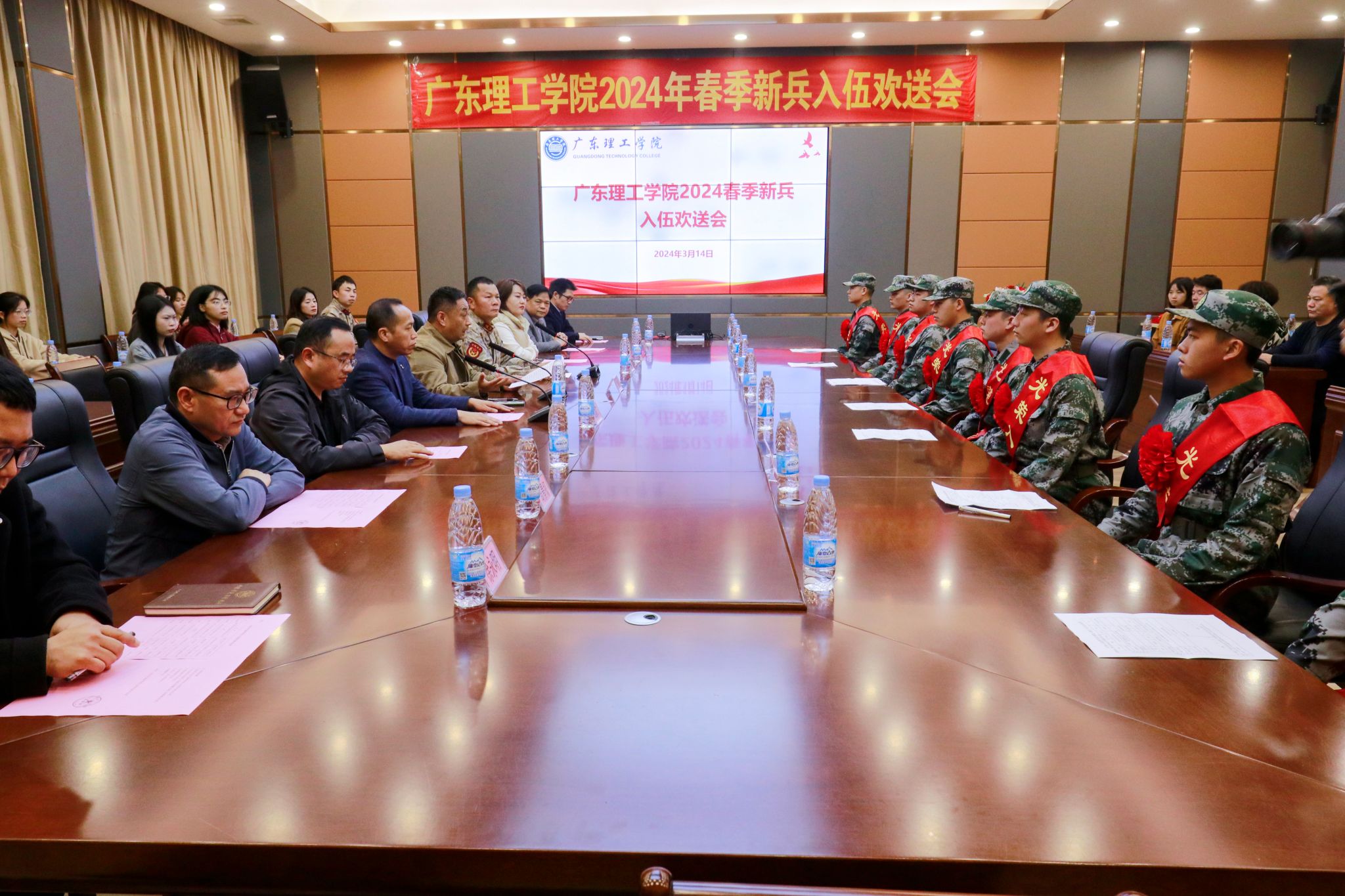 本网讯(武装部)3月14日下午,beat365官网在高要校区行政楼101会议室隆重举行2024年春季新兵入伍欢送仪式,为即将踏上军旅征程的8名新兵送行。学校党委副书记张宗珊、学生处处长谭蒙革、党委宣传部部长张冬、教务处副处长陈木荣以及相关二级学院征兵工作小组负责人和学生辅导员、家长参加会议。武装部部长曾荫初主持会议。