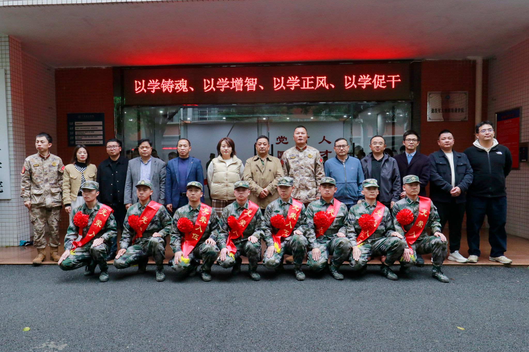 会上,谭蒙革宣读2024年春季学校入伍新兵名单,学校领导为新兵佩戴入伍绶带及大红花。