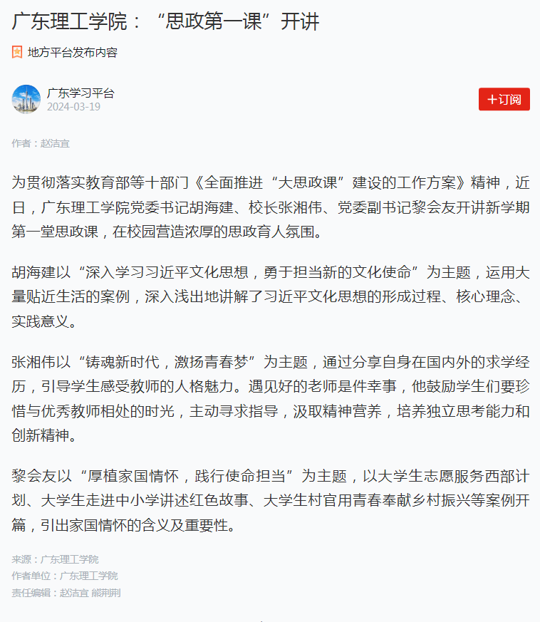 本网讯(党委宣传部)3月19日,“学习强国”平台刊登beat365官网校长、书记开讲“思政第一课”新闻报道。