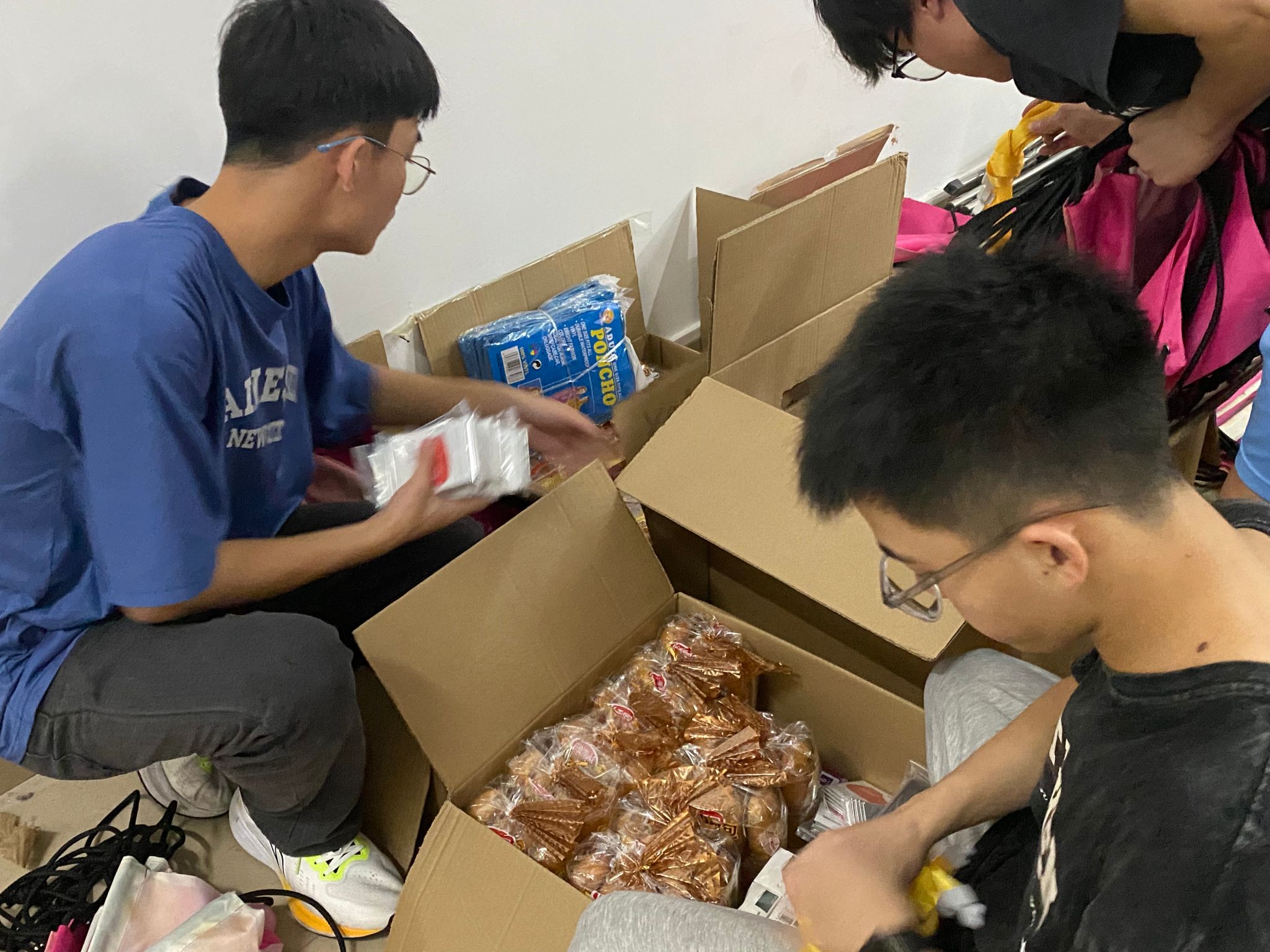 赛前,为更好地保证赛事进行,志愿者们认真清点和整理赛事工作证、T 恤、雨衣、背袋以及食品补给包等物资,他们细致入微的态度饱含着对这次马拉松参赛者的关怀与对赛事的期待。