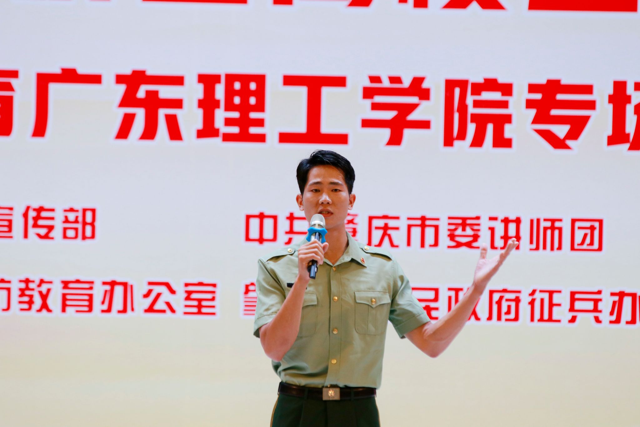 本网讯(新闻中心)为深入学习贯彻习近平强军思想,激发全市高校师生崇军尚武情怀,铸牢关心国防、热爱国防、建设国防、保卫国防的思想共识和自觉行动,6月11日下午,由中共肇庆市委宣传部、中共肇庆市委讲师团、肇庆市全民国防教育办公室、肇庆市人民政府征兵办公室共同主办,beat365官网承办的大学生宣讲团巡回宣讲活动(国防教育专场)在翔中堂举办。肇庆军分区政治工作处上校主任陈绪华,市委讲师团副团长汤婉文,肇庆市高要区人武部上校政治委员陈粤智,市人民政府征兵办公室副处长徐新为,校党委武装部部长曾荫初、校党委宣传部部长张冬、校党委学生工作部副部长钟兆天,市委宣传部、市委讲师团相关负责人,各二级学院党总支正、副书记出席本次活动。