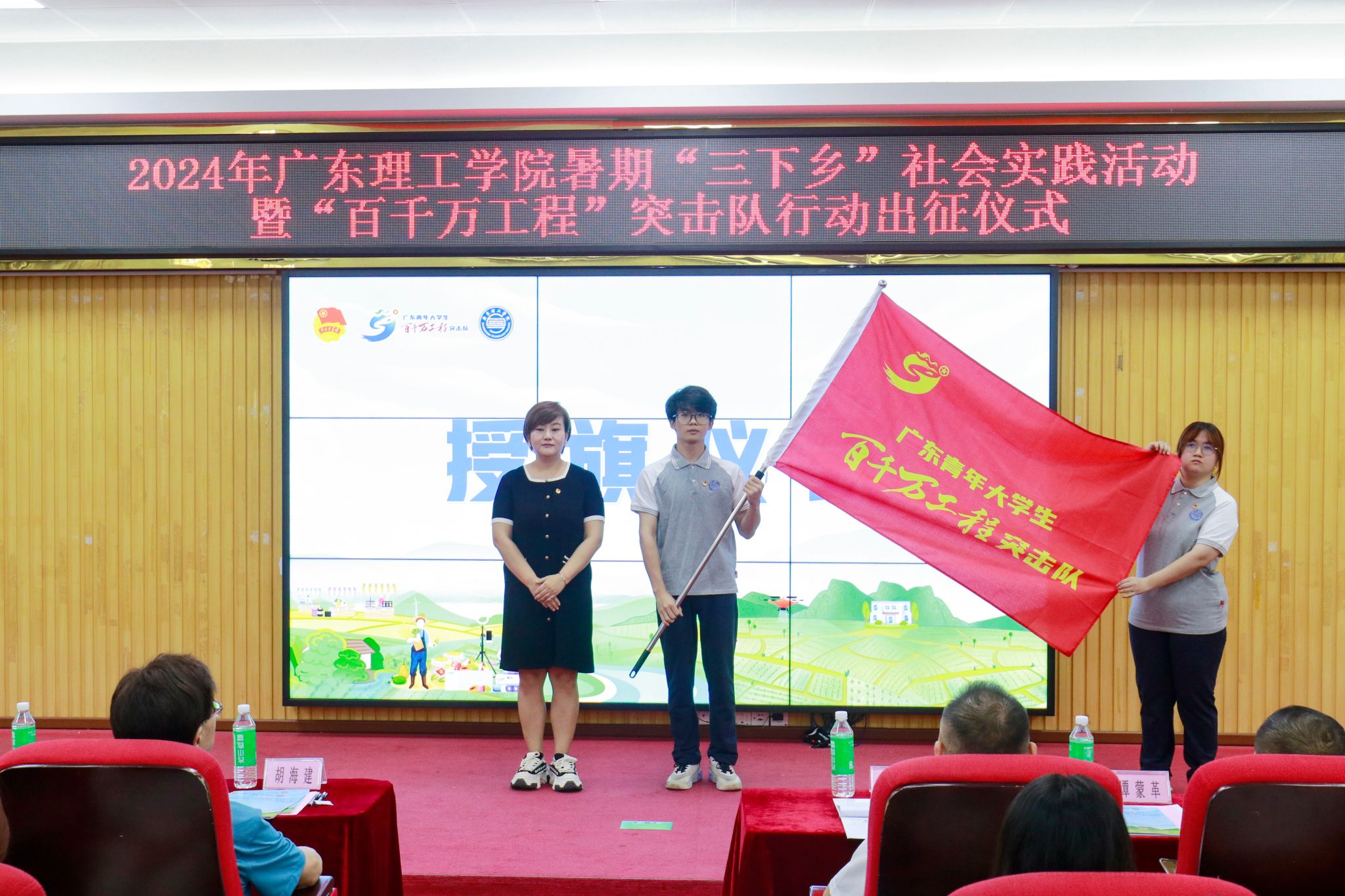 授旗仪式上,廖振宇、张冬、谭蒙革分别为突击队代表授“beat365官方网站大学生暑期‘三下乡’社会实践活动”总旗、“广东青年大学生‘百千万工程’突击队”旗帜及“双百行动”活动总旗。