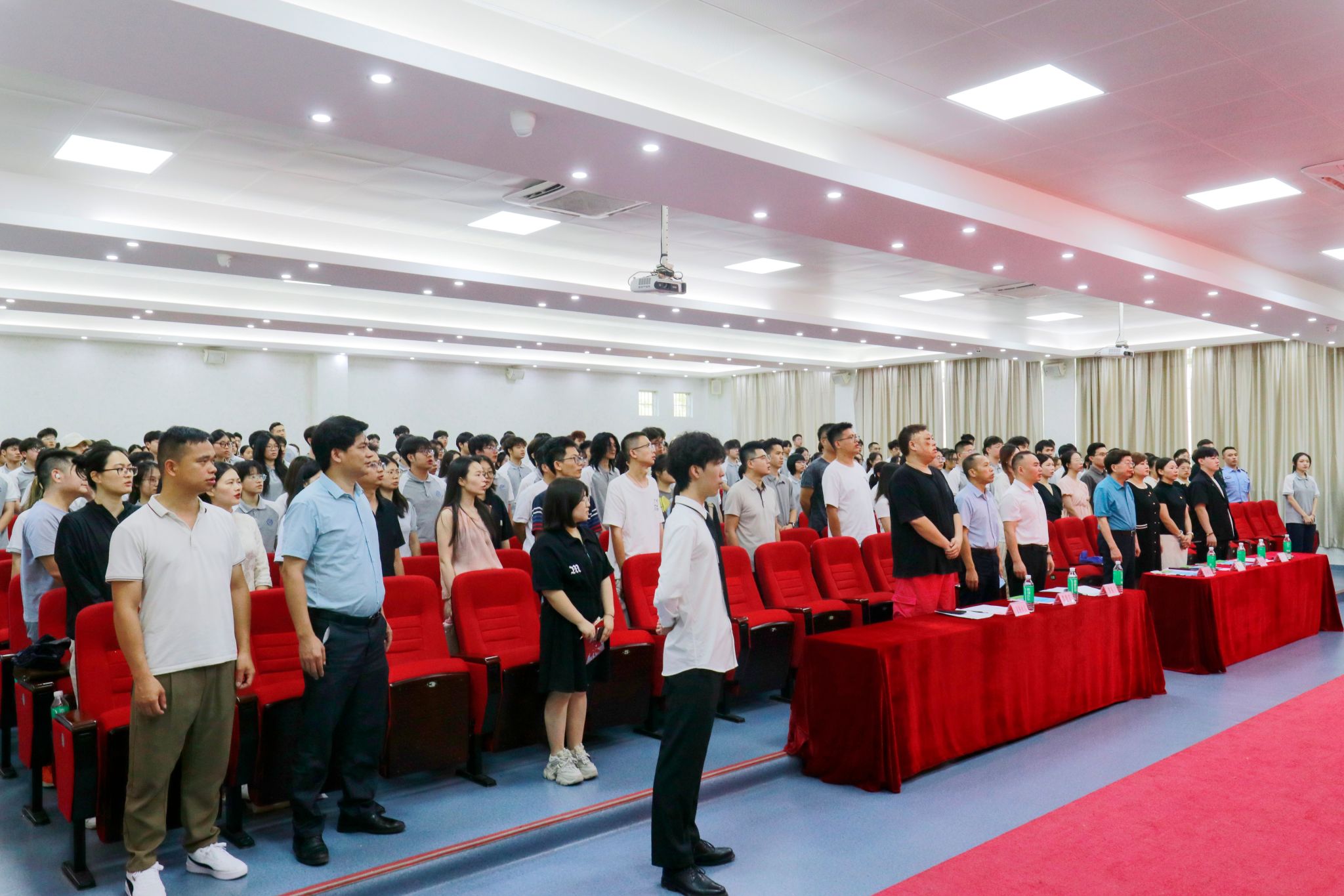 党委书记胡海建、党委组织部部长廖振宇、党委宣传部部长张冬、学生处处长谭蒙革、团委副书记邢媛满、团委专职团干、各突击队指导老师及学生代表参会。会议由团委教师魏娜娜主持。大会在庄严肃穆的国歌声中拉开序幕。