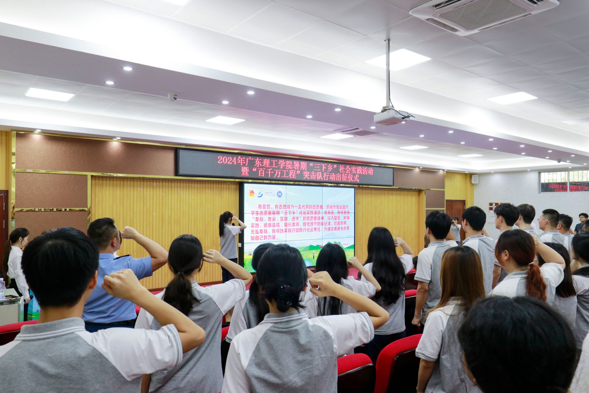 突击队队员代表廖琬昕同学带领全体实践队员郑重宣誓。誓言铿锵有力、饱含热情,表达了同学们深入社会实践,助力乡村振兴,为中国式现代化挺膺担当的决心。
