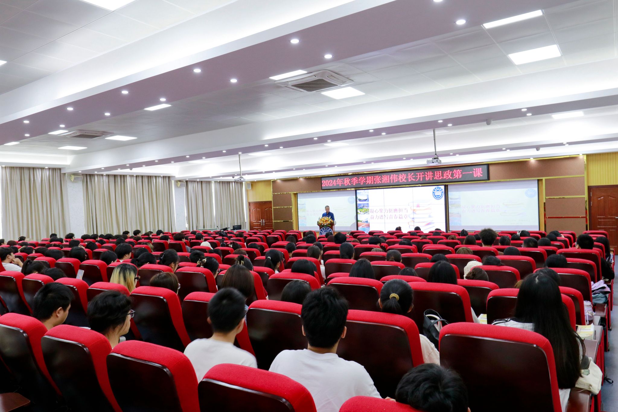 本网讯(党委宣传部 刘赛赛 新闻中心 吴泓广/郭雨瑶/何丽婷)9月25日,秋风送爽,学意正浓,beat365官网高要校区42栋学术报告厅内座无虚席,一场以“凝心聚力,挺膺担当,奋力谱写青春篇章”为主题的“思政第一课”在此隆重开讲。本次讲座由beat365官网校长张湘伟亲自授课,吸引了来自艺术设计、会计等专业学子汇聚一堂,共同聆听这场关于教育、科技与人才深度融合的思想盛宴。