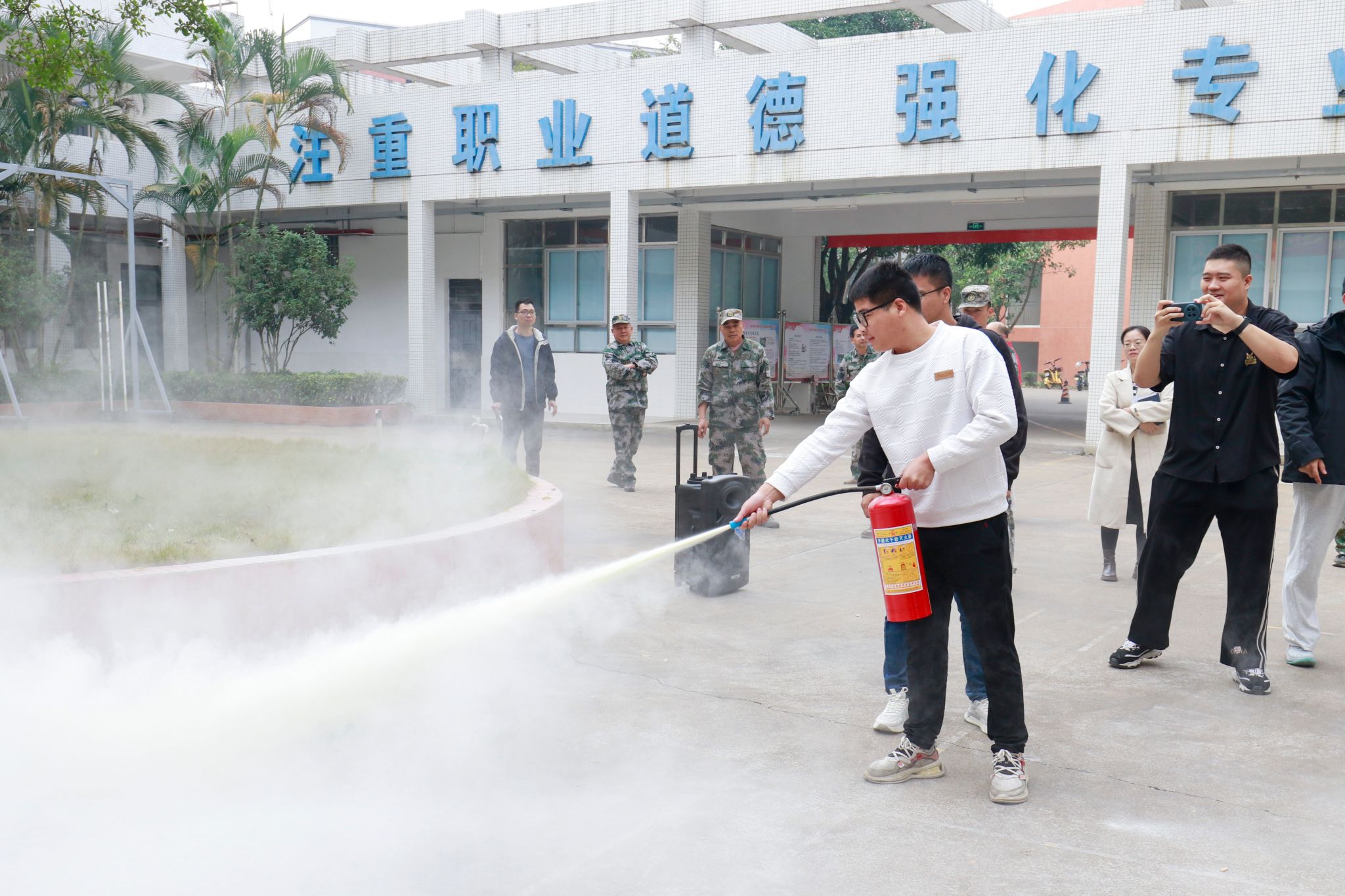 培训结束后,随着警报响起,消防演练正式开始。本次消防演练火灾场景设定在8号教学楼1至3楼楼梯间区域,听到警报后,全体师生迅速掩住口鼻,有序进行紧急疏散,快速撤离到疏散安置点。同时,灭火组到达现场,迅速开展灭火救援、设备保障等工作,并现场指导师生学习使用灭火器扑灭火源,掌握“提、拔、瞄、压”的规范操作。