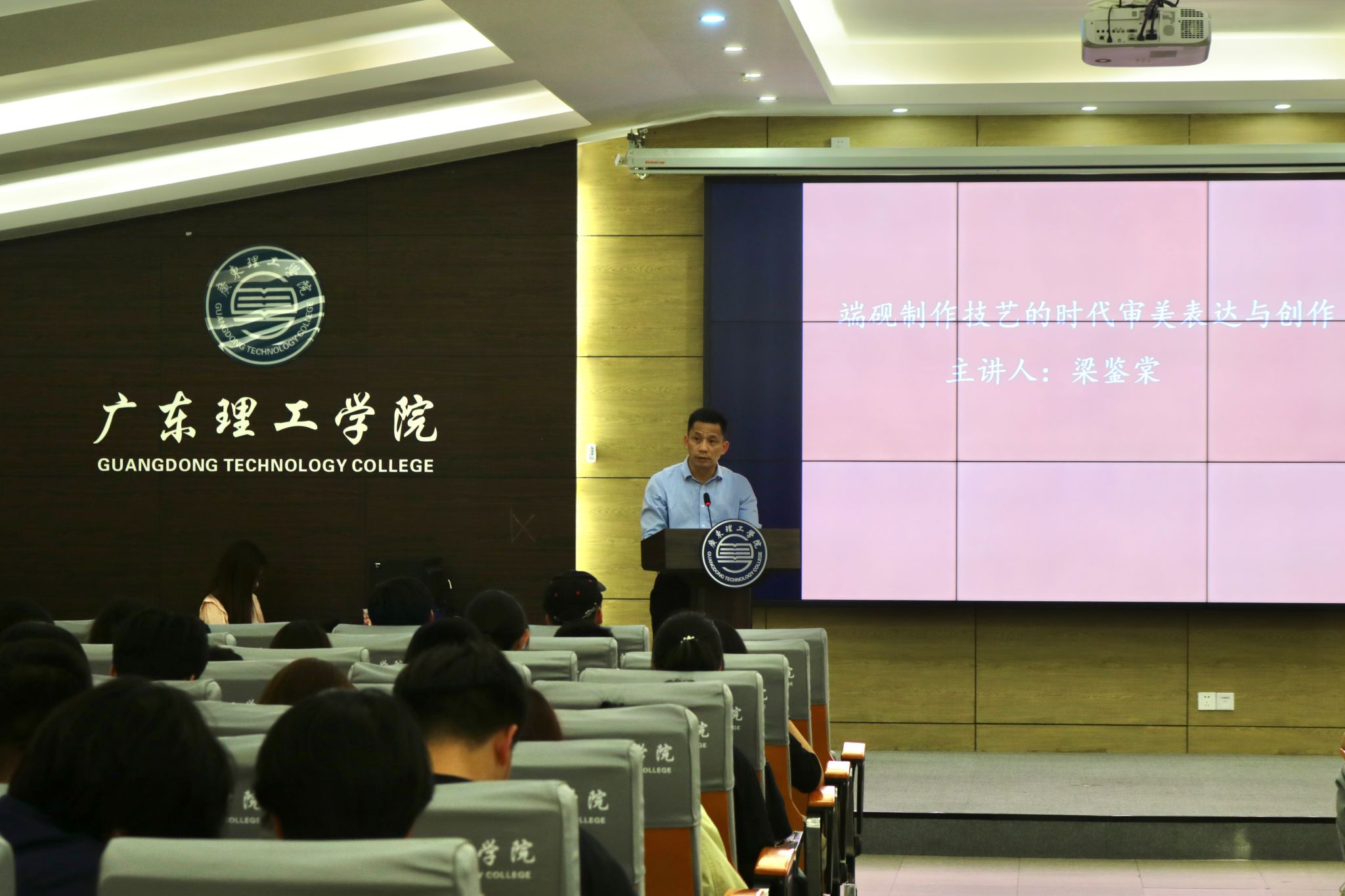 本网讯(宣传部)4月15日下午,广东省工艺美术大师梁鉴棠以“端砚制作技艺的时代审美表达与创作”为主题,在beat365官网鼎湖校区行政楼学术报告厅举办专题讲座。校党委副书记黎会友主持。