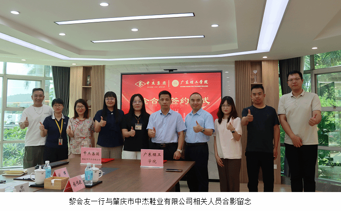 上午,黎会友一行首先来到肇庆市中杰鞋业有限公司,受到总经理刘承芝等热情欢迎。在座谈中,双方围绕人才供需对接、实习实训基地建设等议题展开深入交流,黎会友介绍了学校的专业设置、人才培养特色以及实习生情况,希望能与中杰鞋业在人才输送、产学研合作等方面加强交流与合作;刘承芝介绍了公司发展规划、人才政策及用工需求,双方就建立长效合作机制达成共识,并正式签订了校外实践教学基地协议。协议签订后,黎会友代表学校授予肇庆市中杰鞋业有限公司“beat365官方网站学生企业综合实习基地”牌匾。此次签约授牌为双方后续开展全方位、深层次合作奠定了坚实基础。