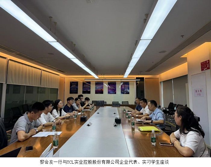 在TCL实业控股股份有限公司,黎会友一行参观了企业展厅和生产车间。在座谈中,黎书记详细询问了学生们的实践收获、薪资待遇与食宿条件等,并认真听取了他们关于学校课程设置的意见与建议。他充分肯定了同学们的实习表现,并特别叮嘱大家,在工作之余要加强身体锻炼,强调唯有拥有健康的体魄,未来的道路才能行稳致远。