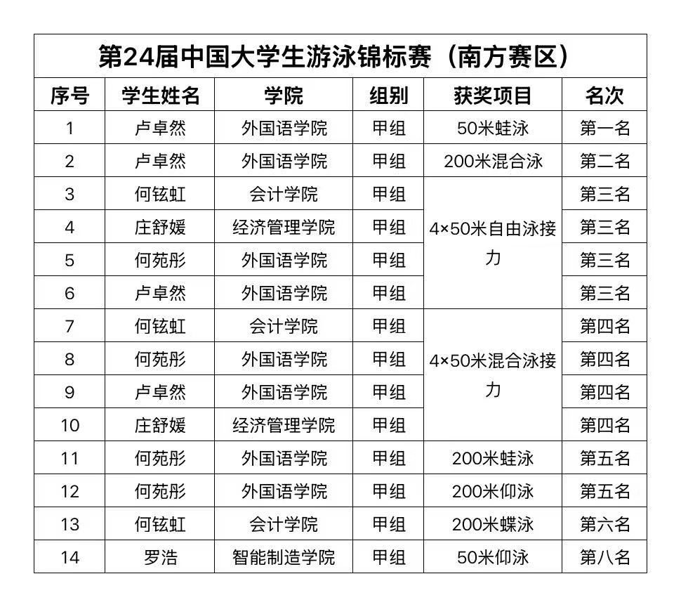 本网讯(体育学院)11月7日至13日,第24届中国大学生游泳锦标赛(南区)在福建省厦门市奥体中心游泳馆隆重举行。这场汇聚了华东、华南、华西等地区高校游泳精英的赛事,吸引了包括上海交通大学、中山大学在内的全国105所高校,共计806名运动员参加,众多泳坛骄子在此上演了一场精彩的巅峰对决。