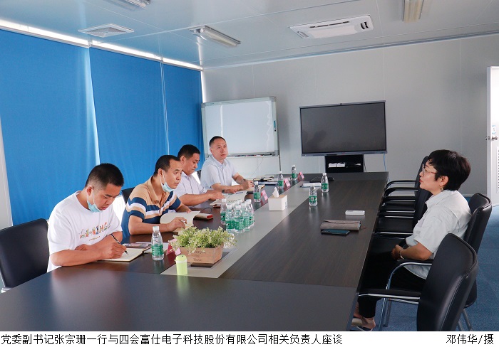 在四会富仕电子科技股份有限公司,人事总经理范永梅介绍了公司的发展概况和人才需求情况,表示在外语方面有很大的人才缺口,并希望双方在接下来有更多的交流合作。随后带领众人参观了车间生产线。